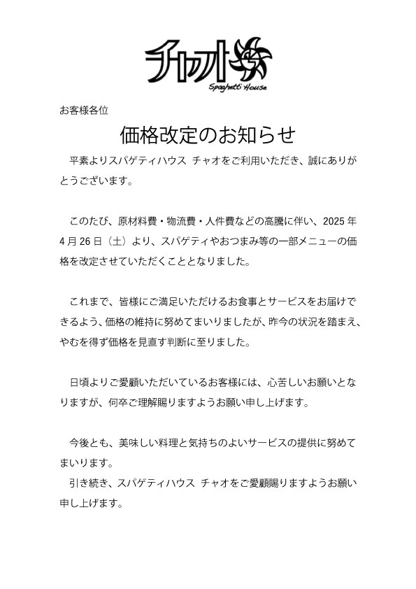チャオ・チャオニーノ年末年始営業時間のお知らせ