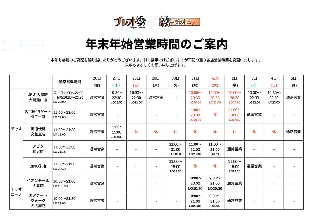 チャオ・チャオニーノ年末年始営業時間のご案内