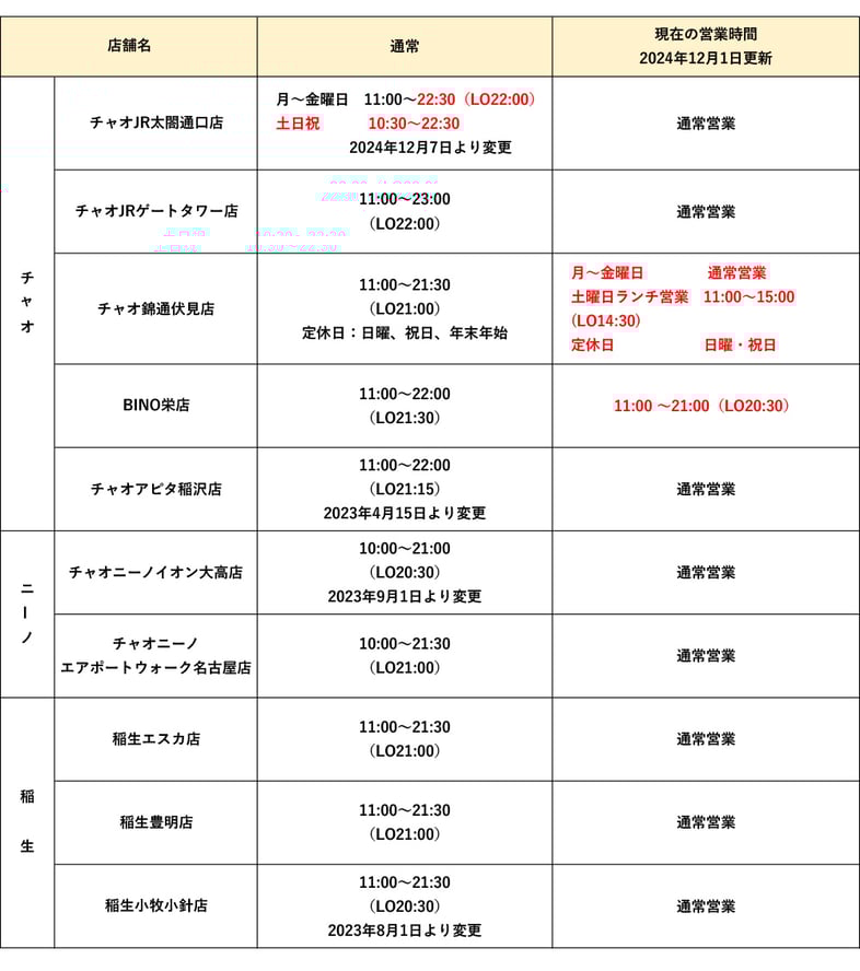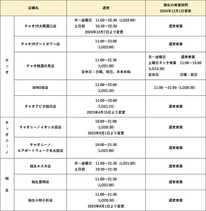 チャオニーノエアポートウォーク名古屋店休業のお知らせ